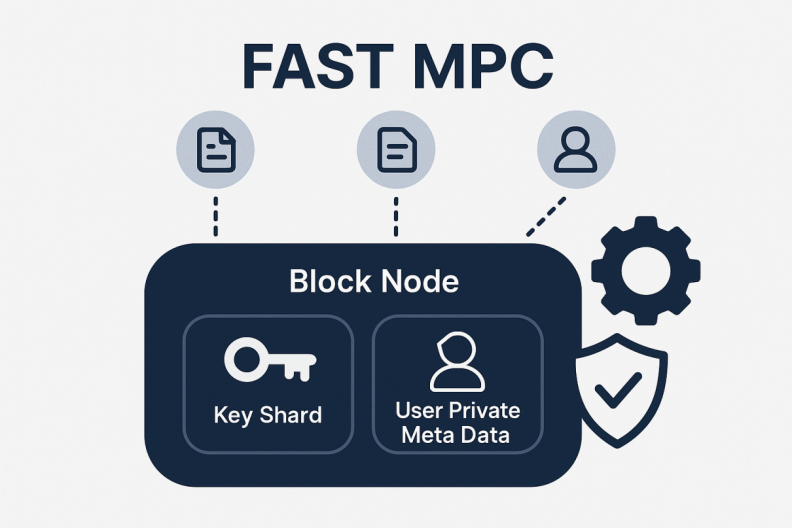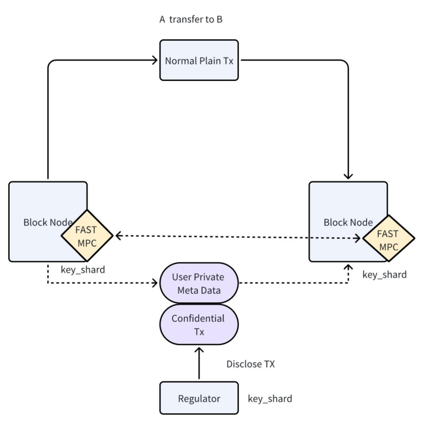 2. Generate Confidential Transaction: The transaction enters the Block Node. The system’s FAST MPC module uses its held Key_shards to process the User Private Meta Data, producing an encrypted Confidential TX. This confidential transaction is then sent back to the Block Node for on-chain recording.