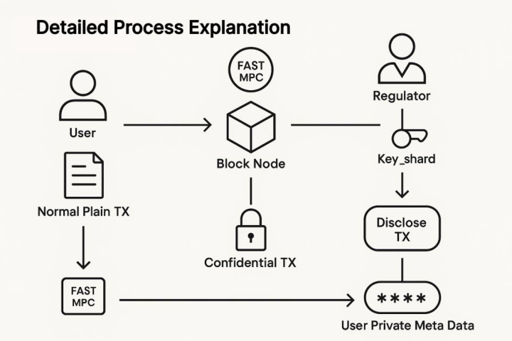 4. Transaction Disclosure: When a transaction requires regulatory review or audit, the Regulator initiates a Disclose TX request. This request combines the Regulator’s Key_shard with the User Private Meta Data. Specifically: a. The Regulator’s shard combines with the Block Node’s shard to reconstruct or access the User Private Meta Data. b. Only when the regulatory process is triggered and the Regulator’s authority is verified can the contents of the Confidential TX be conditionally and controllably disclosed via MPC or decryption mechanisms.