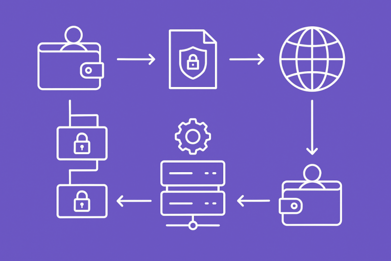 Users send a request to a trusted network node via their wallet. The request includes a digital signature generated with the user’s private key to prove ownership.
